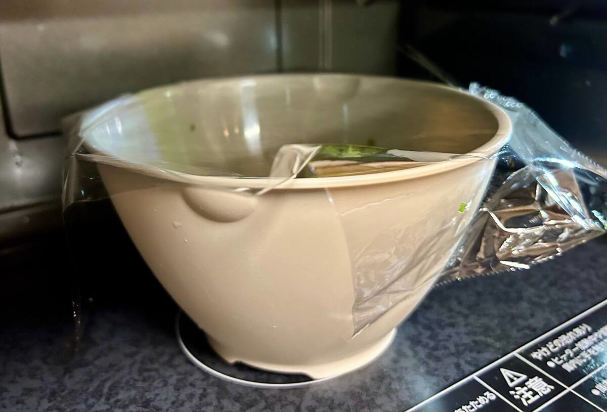 大きめの耐熱ボウルに、みじん切りにした長ネギ、キャベツの芯、にんにく、ごま油を入れたら、ふんわりラップをして電子レンジ(600W)で2分加熱しましょう。