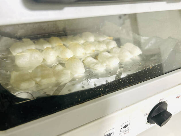 加熱すると餅は想像以上に「ぷく〜っ」と膨らみます。隣同士がくっつかないよう、間隔をあけて並べるのがお約束です。