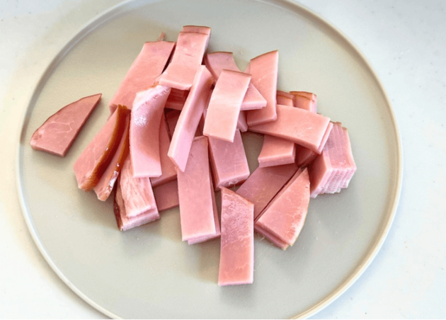 ハムも1cm×3cmくらいの大きさに切りましょう。