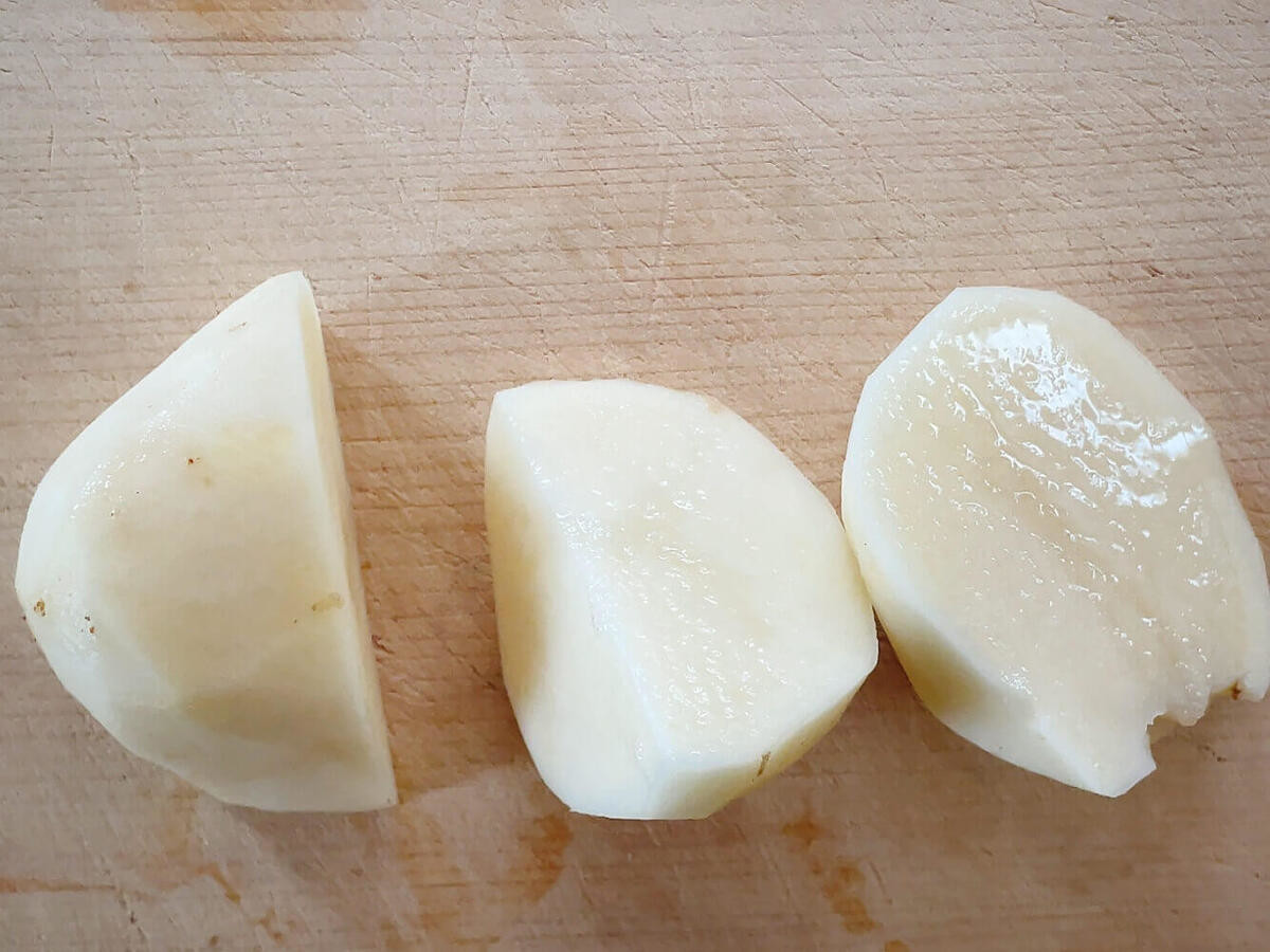 ただ、3等分に切ったじゃがいもは15分ではまだかたく、つぶせる状態にはならず……。
