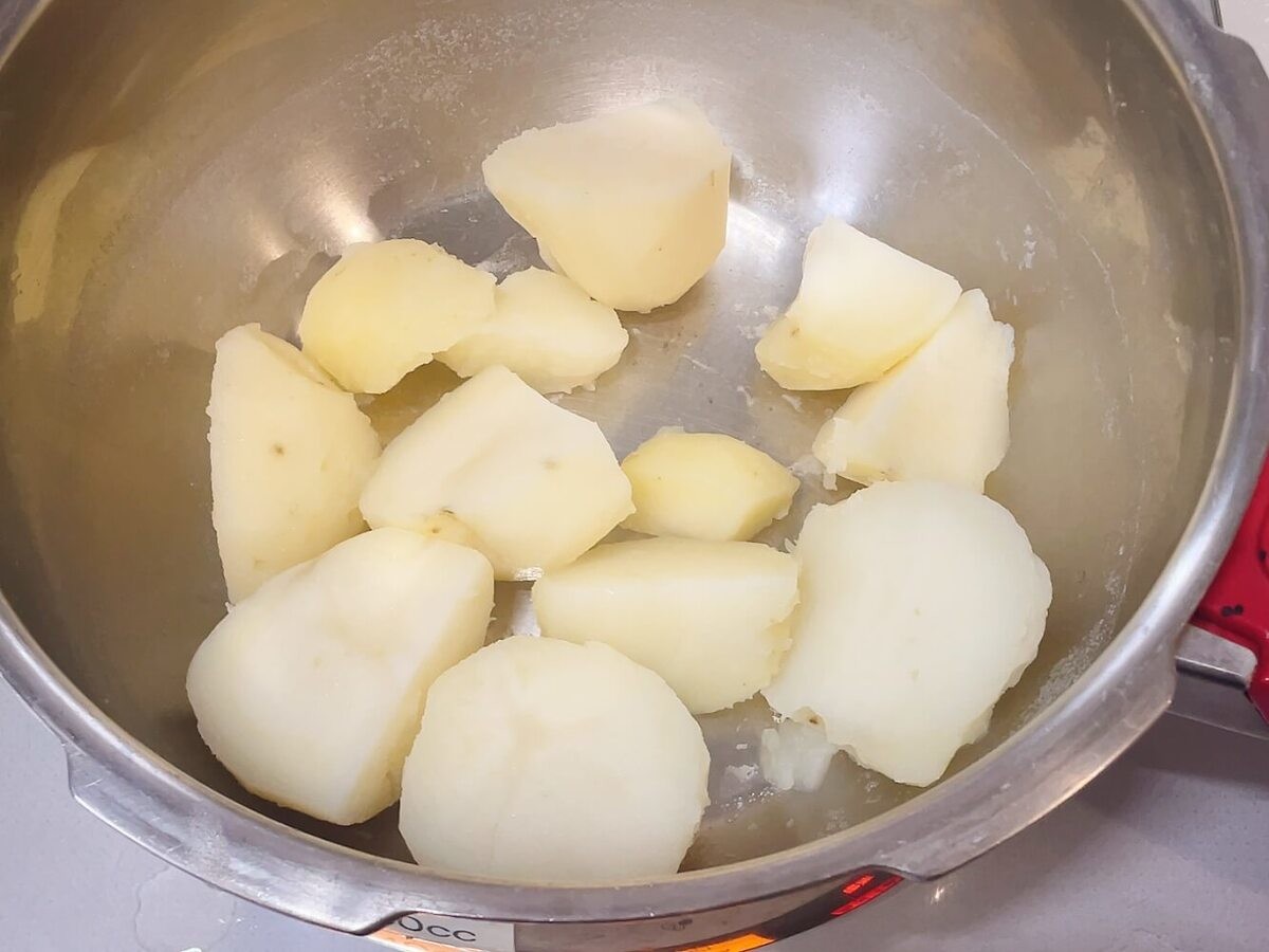 じゃがいもがゆで上がったら、ゆで汁を捨て、鍋を再び中火にかけて10秒ほど加熱し、水分を飛ばします。