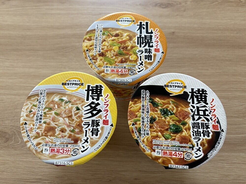 今回ご紹介するのは、"トップバリュ"ベストプライスから販売されているご当地カップ麺3種。