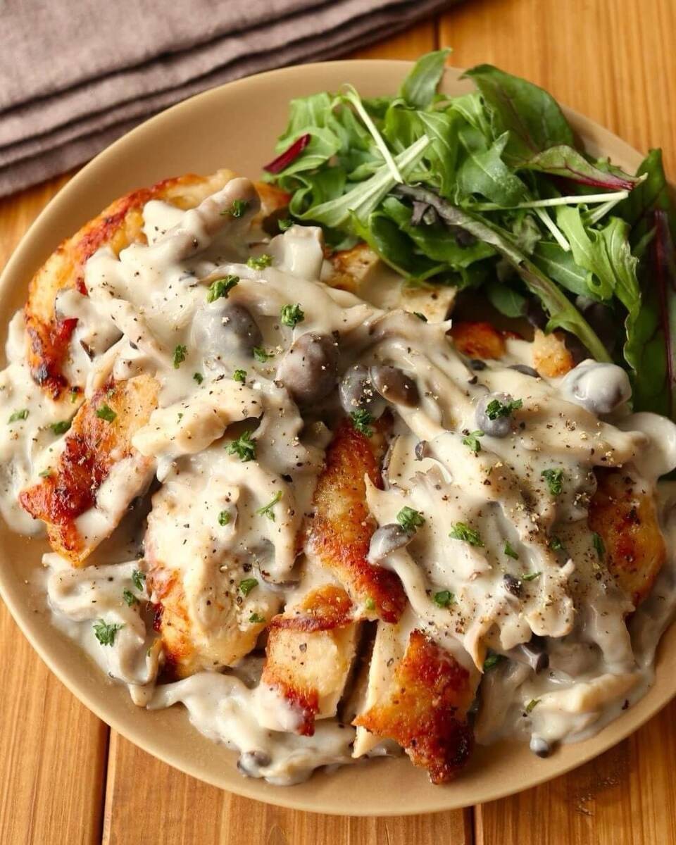 柔らかくてジューシーなチキンステーキと、濃厚でクリーミーなきのこクリームソースが相性抜群!