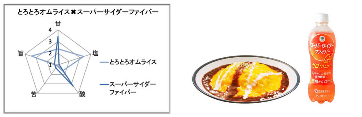 酸味や炭酸の刺激がしっかり感じられるサイダー系飲料が、濃厚でとろとろなオムライスのコクや旨味の印象を“すっきり整えて”、後味のキレを高める効果があることが分かったのです。