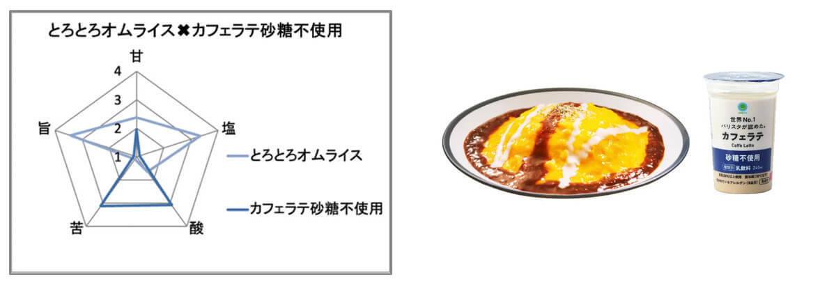 味覚センサーAIの分析結果をもとに、このオムライスと一緒に楽しむと、味わいをよりバランスよく感じられる「ファミリーマートで販売中の飲料」との組み合わせも検証されました。