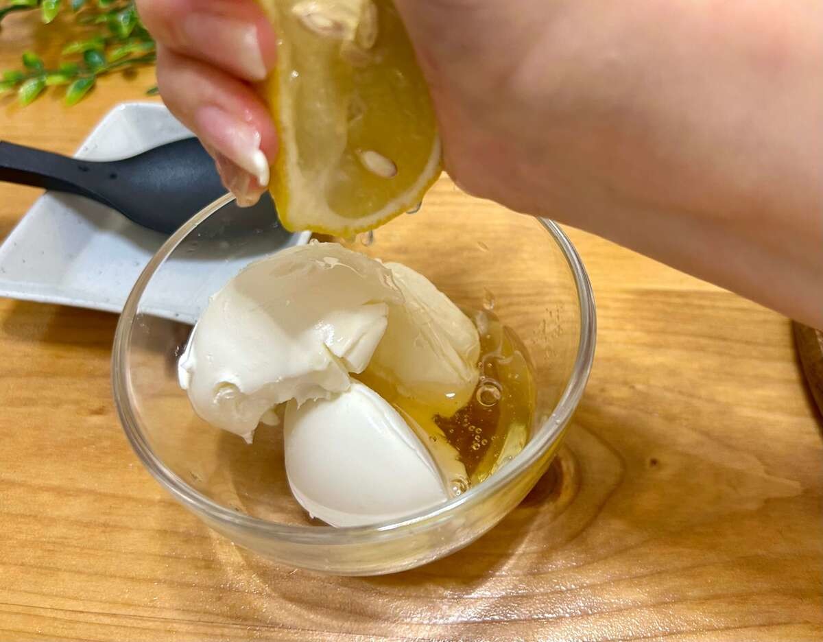 ボウルにクリームチーズとハチミツを入れて、レモンをしぼったら混ぜ合わせましょう。