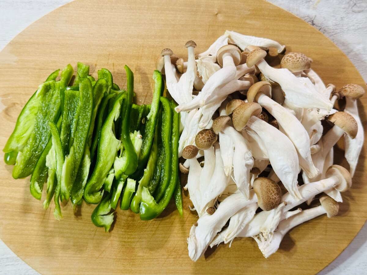 また、ピーマンは縦に5mm幅に切り、しめじは1本ずつにほぐしておきます。