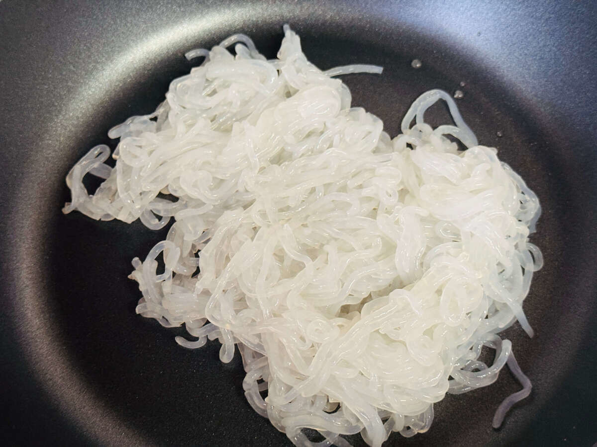 フライパンを温めたら、しらたきを中火で炒めます。 この時点で油は入れず、乾煎りするイメージですね。しらたきの水分をしっかりととばすのがポイントで、筆者の場合は約1分ほど炒めました。