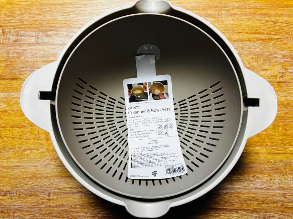 色味がスリーコインズらしい淡いベージュ色で、何を入れてもおしゃれに見える気がします。我が家では、娘がお米を研ぐときに大活躍しています。