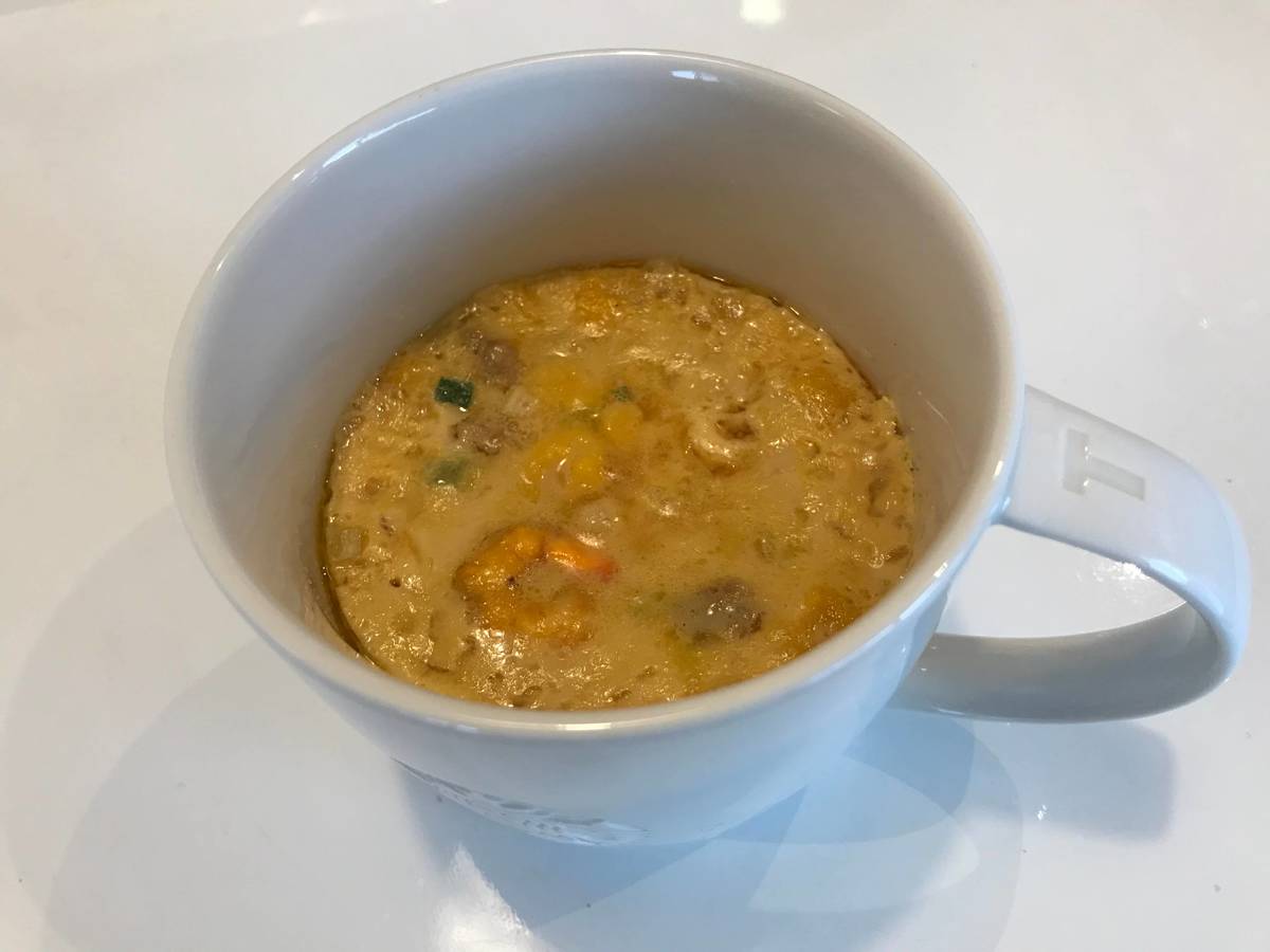 マグカップに移して、ラップをして電子レンジ200wで2分30秒チンします。