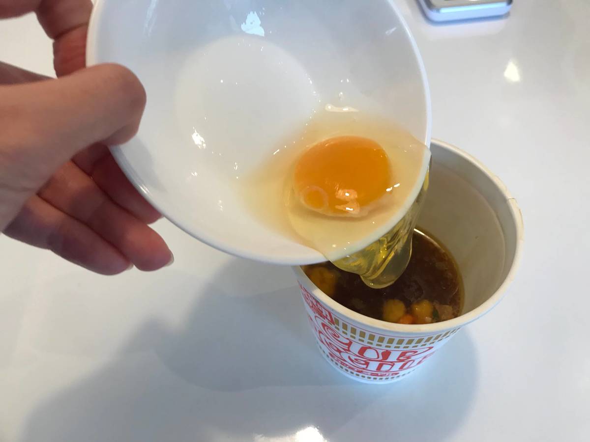 麺を食べ終わったら、残ったスープに生卵を入れて、よくかき混ぜる。