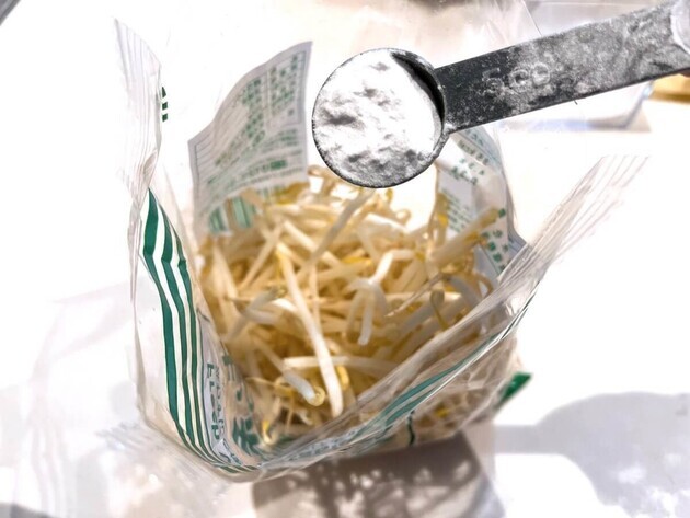 時短&手間抜き: もやしの袋に直接片栗粉を入れて振るだけ。これで手が汚れず、洗い物も一つ減るという「ズボラ飯」の鏡のような工程です。