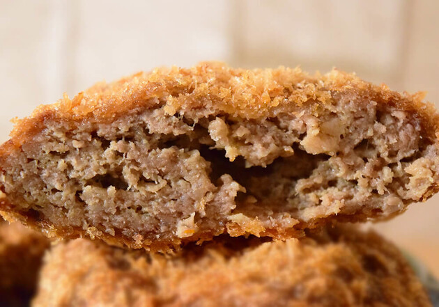 1日400個売れる自家製メンチカツ。国産黒毛和牛と国産豚肉を5対5の割合で使用しています。サイズはごく普通で、大きくも小さくもなく。おかずの一品にちょうどいいですね。