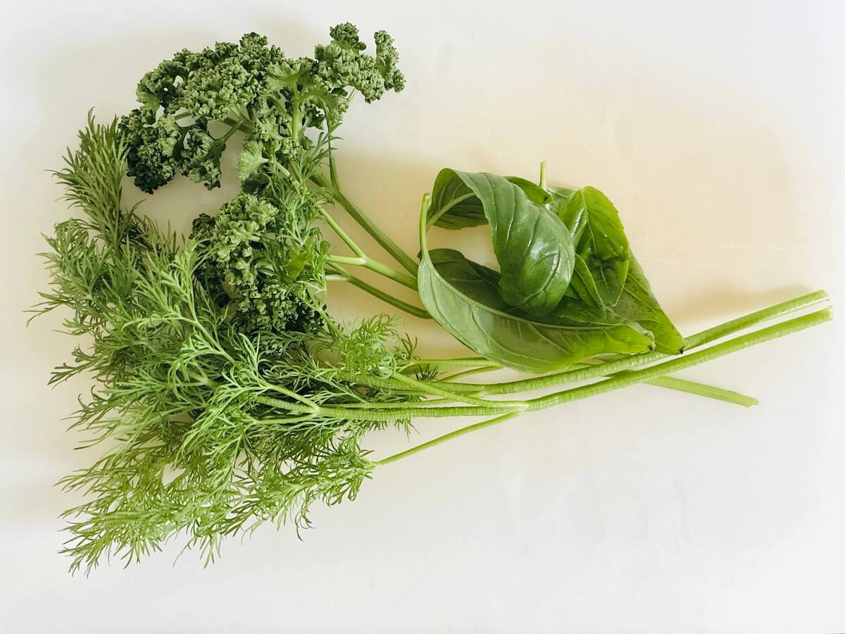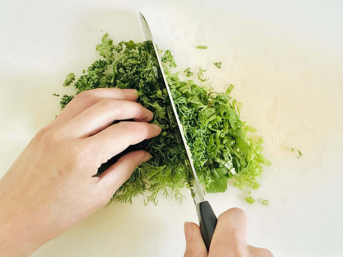 どっさり!たくさんのパセリとディル、バジルはみじん切りにします。