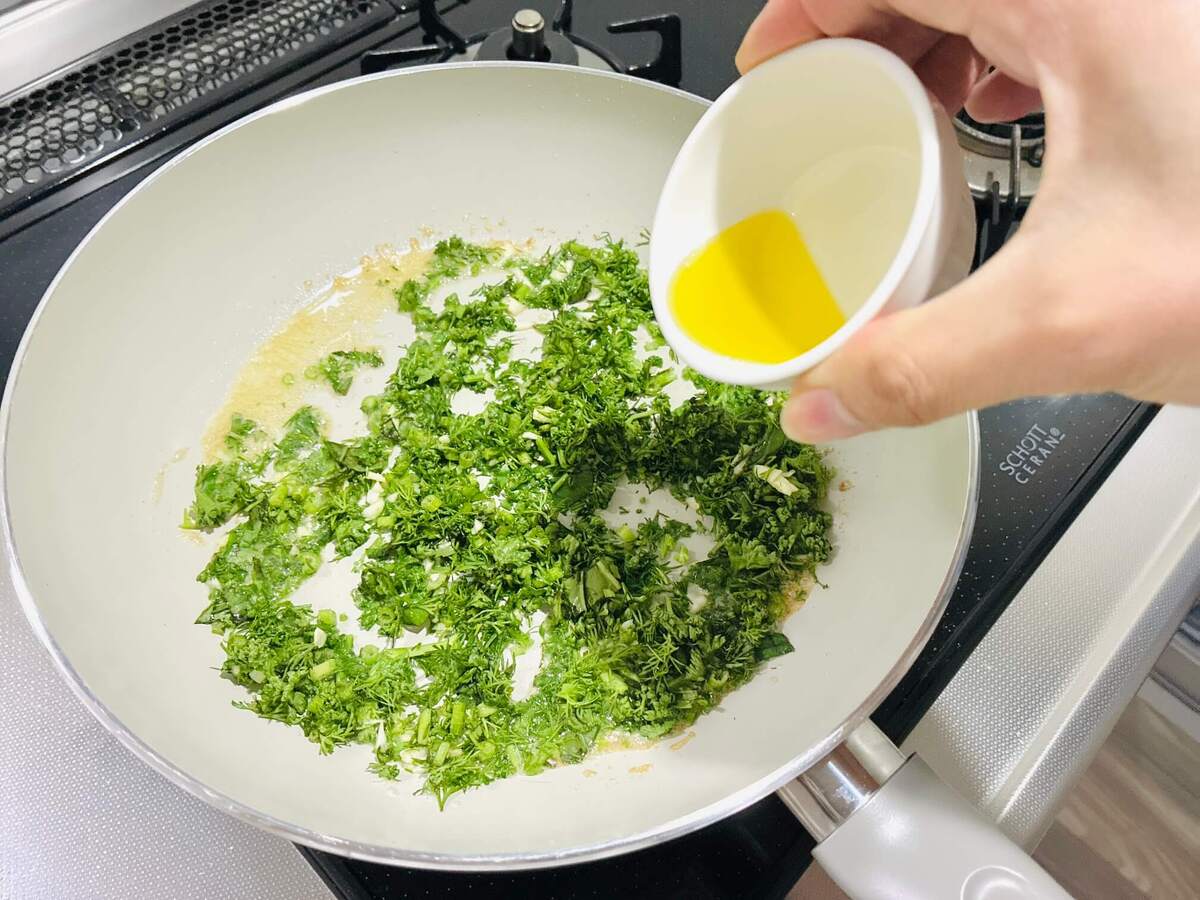 この時にオリーブオイルを加えます。