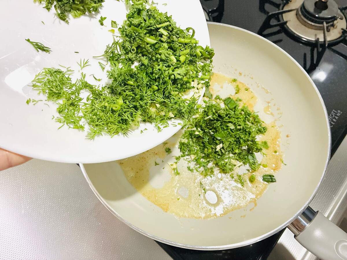 そのままのフライパンで、にんにくと全てのハーブを入れましょう。