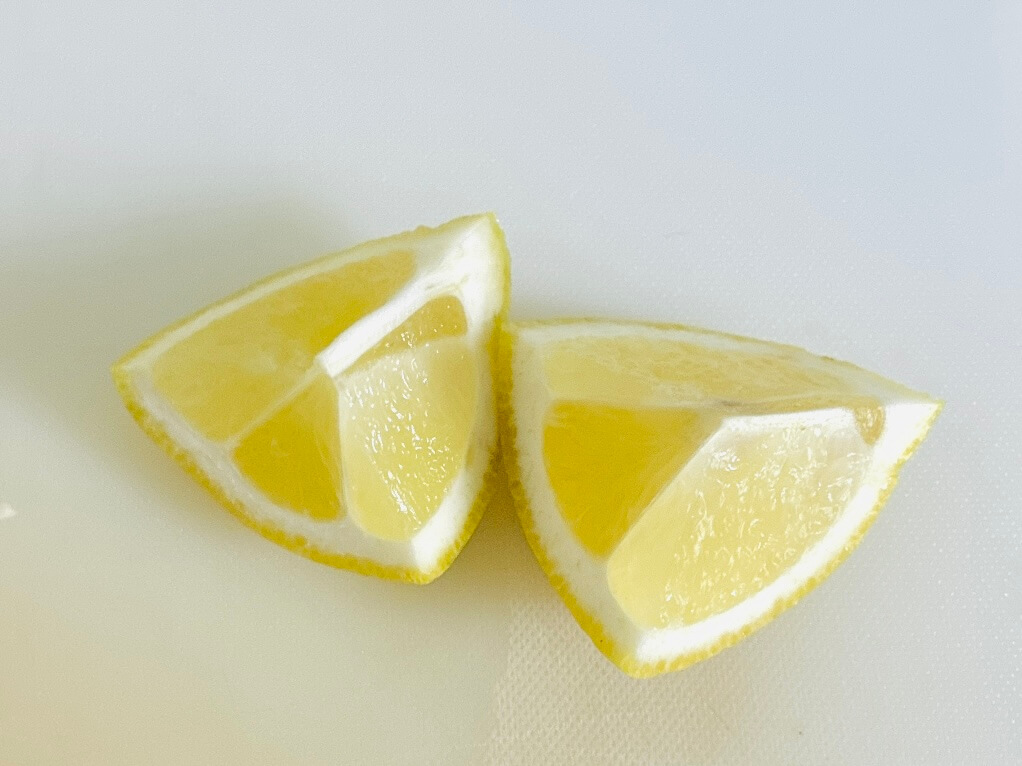 レモンはくし切りにしましょう。私はくし切りにしたあと、絞りやすいようさらに半分に切りました。