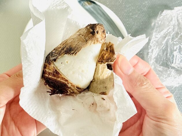 取り出したら、ラップのまま里芋の上下をひっくり返して粗熱がとれるまで放置し、余熱で仕上げます。