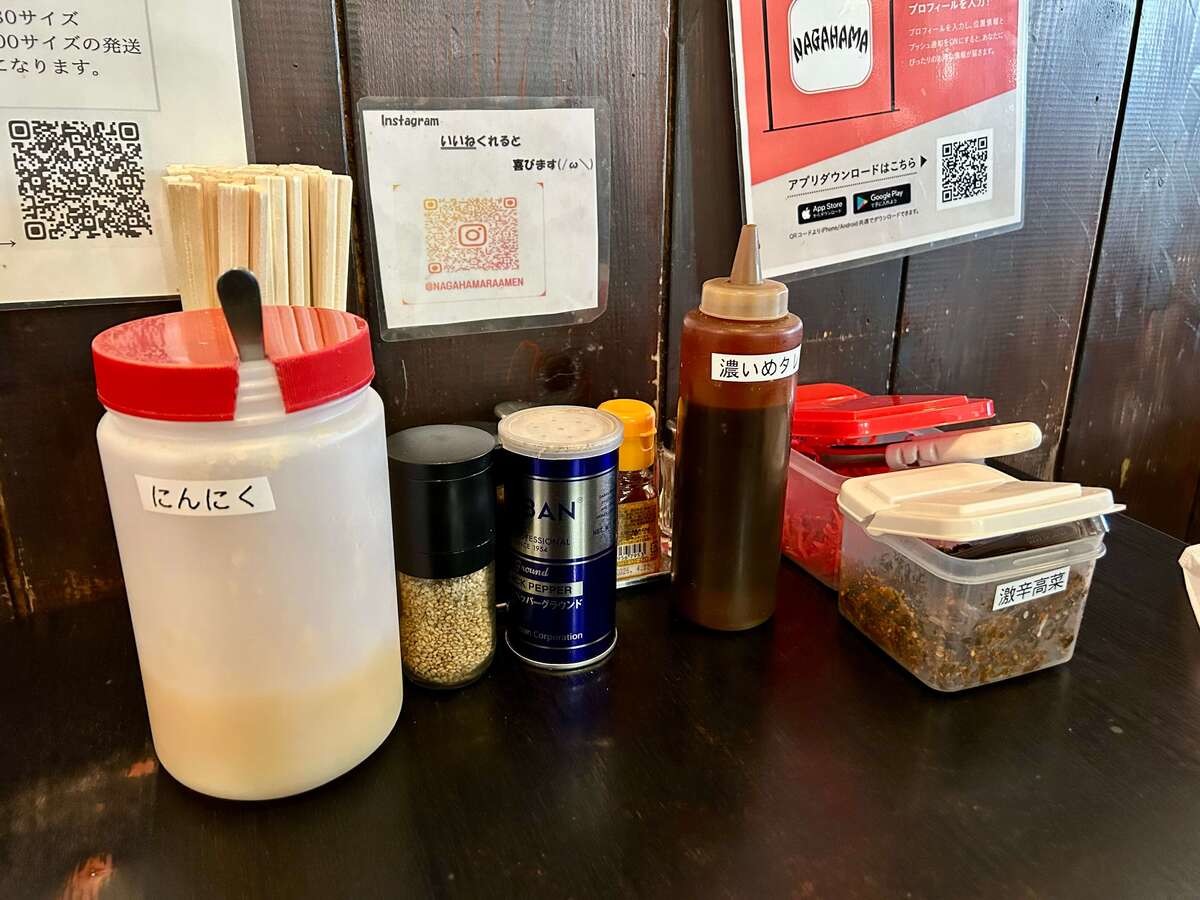 卓上をチェックしてみると、激辛高菜やニンニクなどの味変アイテムが並んでいます。