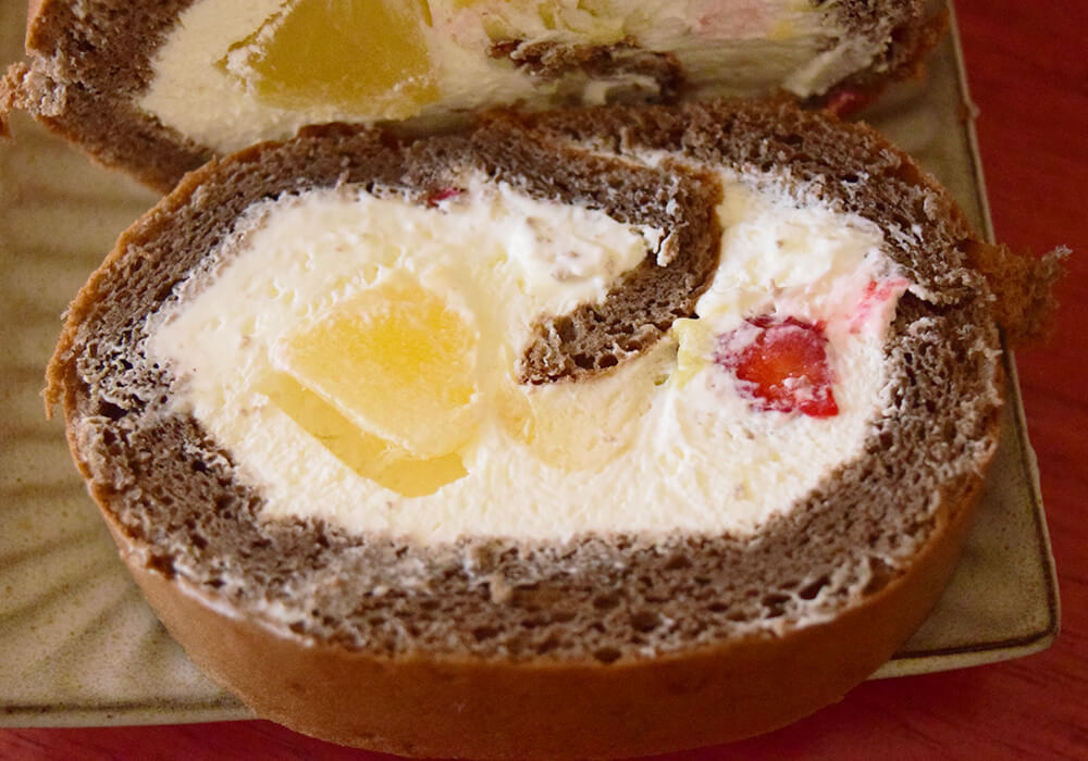 ココアスポンジはやや弾力があり、しっかりとした食感です。カスタードクリームやホイップクリームはややもったりしていますが、甘さはひかえめで食べやすいですね。