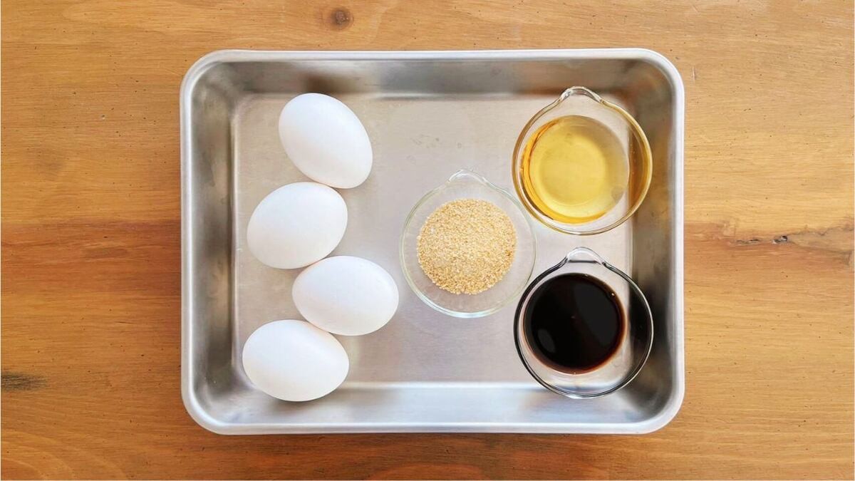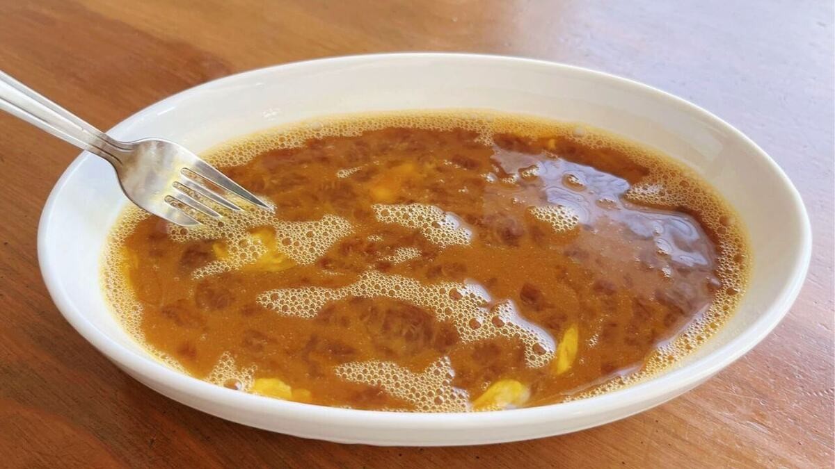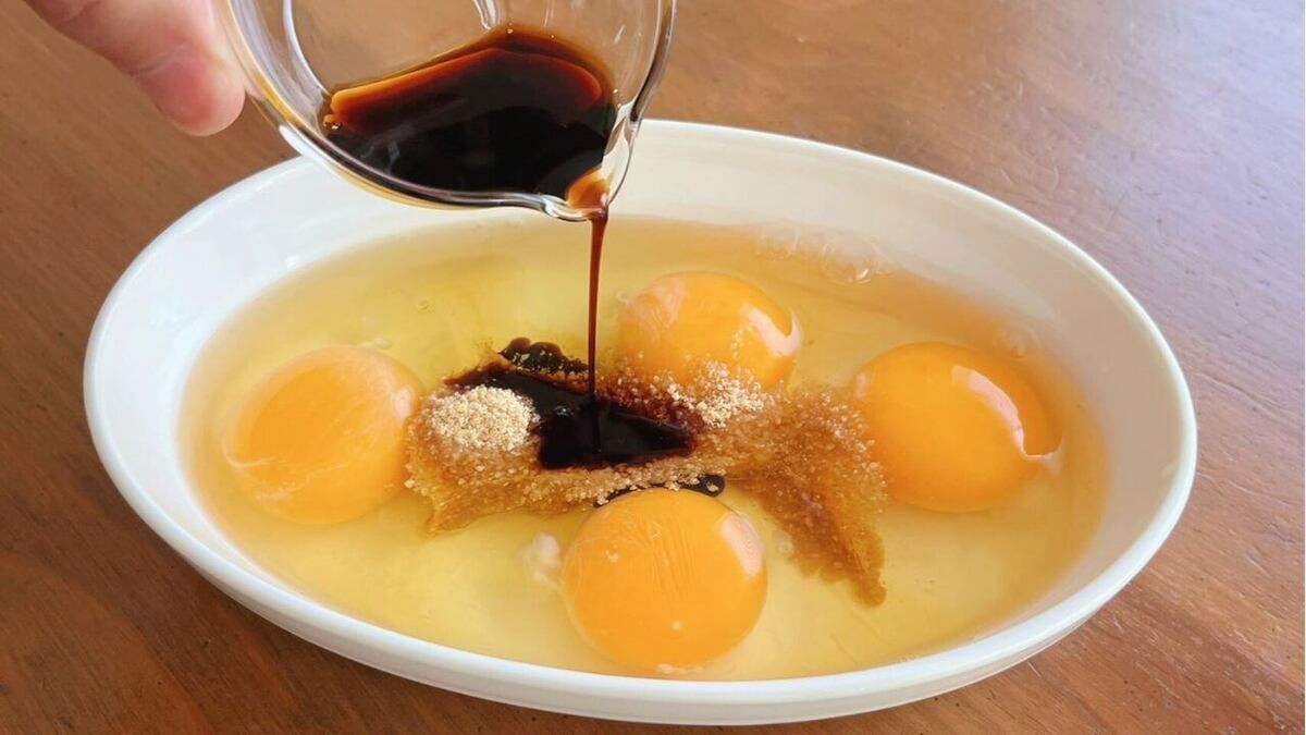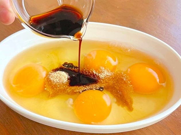 卵を溶きながら、調味料を加え、混ぜ合わせます。