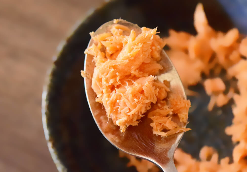 白鮭を使用しているためか、身は全体的に明るい色合いです。白鮭の旨みをベースに、植物油、魚醤、食塩、みりんで味付けされており、辛さはまったくありません。