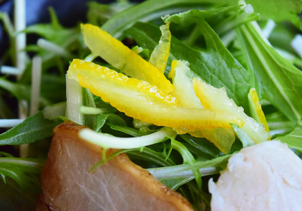 豚と鶏ガラを丁寧に炊きだし、ホタテ・鰹節・昆布の旨味を重ねたスープに、ゆず果汁を効かせてさっぱりとした味わいに仕上げています。