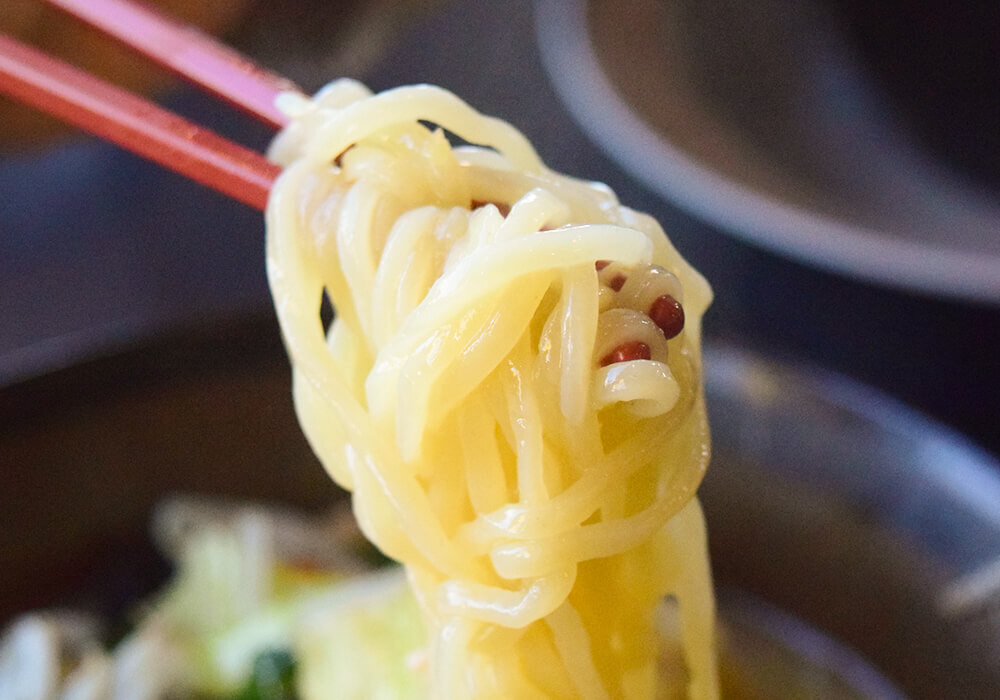 多加水の中太麺で、つるつるとのどごしが良い麺です。幸楽苑おなじみの麺で、あっさり系のスープとも相性が良いですね。