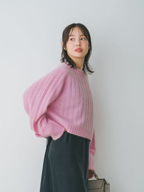 着こなしの鮮度を一気に上げるなら、トレンドのクロップド丈ニットをご指名。腰位置を高く見せるシルエットが、フラットシューズの日でも好バランスを約束します。ボトムスには艶やかな黒のロングスカートを合わせ、ピンクの甘さを都会的に引き締めて。リブの立体感が奥行きを生み、シンプルながらも「ただの甘党じゃない」大人の余裕を感じさせる装いに。
