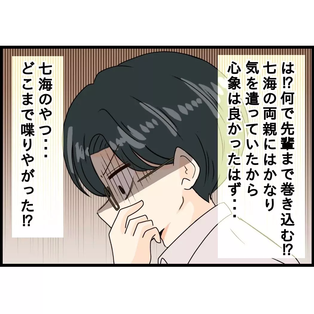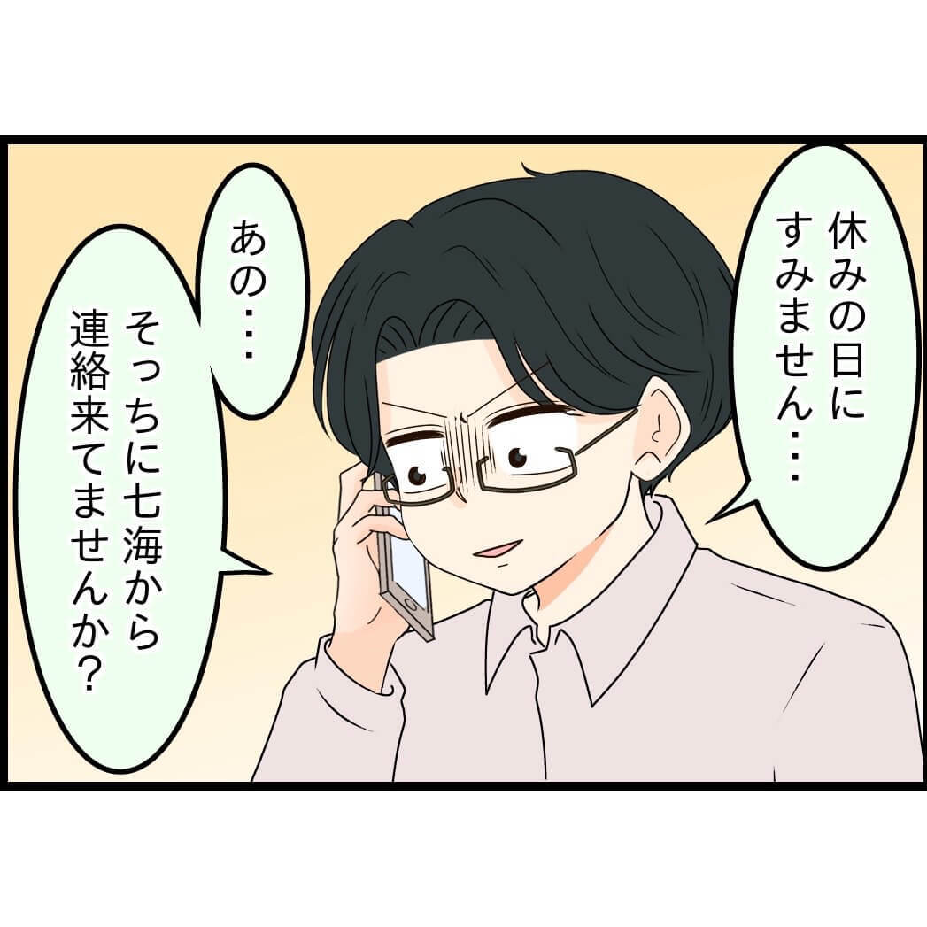 さらに焦ったマコトは、慌てて職場の先輩に連絡。ところが、すでにエースくんのお姉さんが先に先輩へ事情を伝えていたようで、冷や汗が止まらない様子です(そもそも、マコトと七海さんは、この先輩夫婦が仲を取り持ったのでした)。