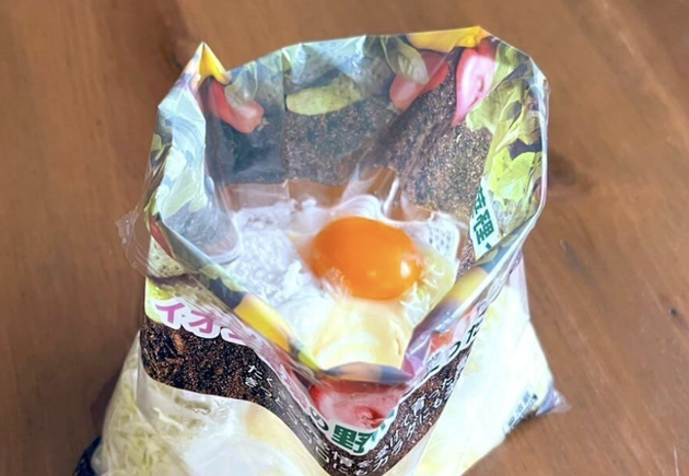 市販の千切りキャベツの袋をそのままボウルにする驚きのアイディアで、面倒なキャベツ切りもボウルの洗い物も一切不要です。