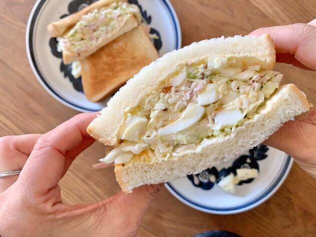 断面から見えるキャベツ、ハム、ゆで卵……具材の多さから高級感すら漂ってきます。スーパーで買った食パンとキャベツで作ったとは思えません。