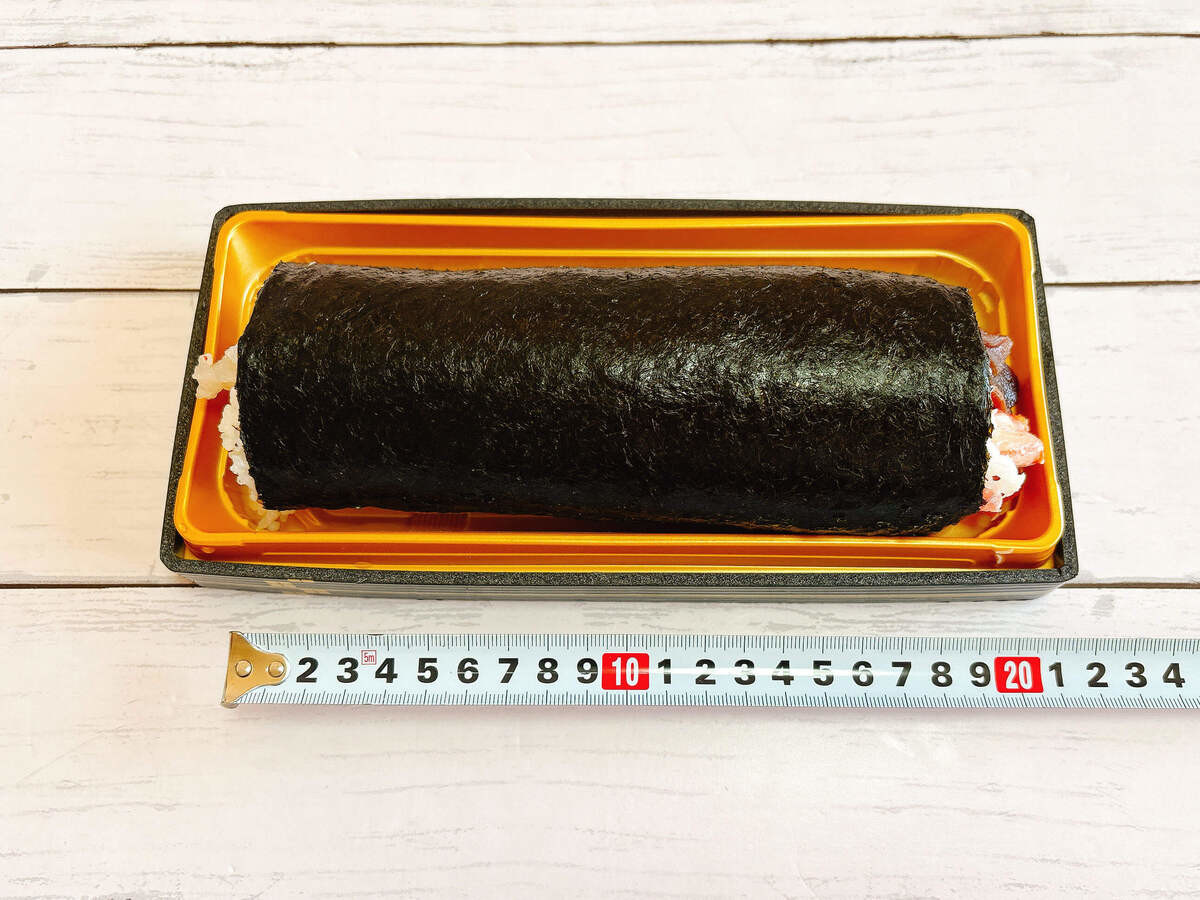 長さは約20cm、重さは500gオーバーです。手に持つとずっしり重さを感じますね。1本1本巻いているようで、端っこからは具材が飛び出ていてお得感がありましたね。