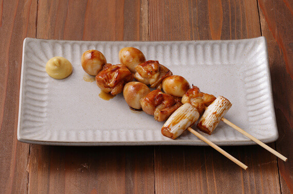 むね串(タレ焼き)の上に、どっさりニラ!こちらも大倉さんのイメージカラーのグリーンをイメージされた商品。