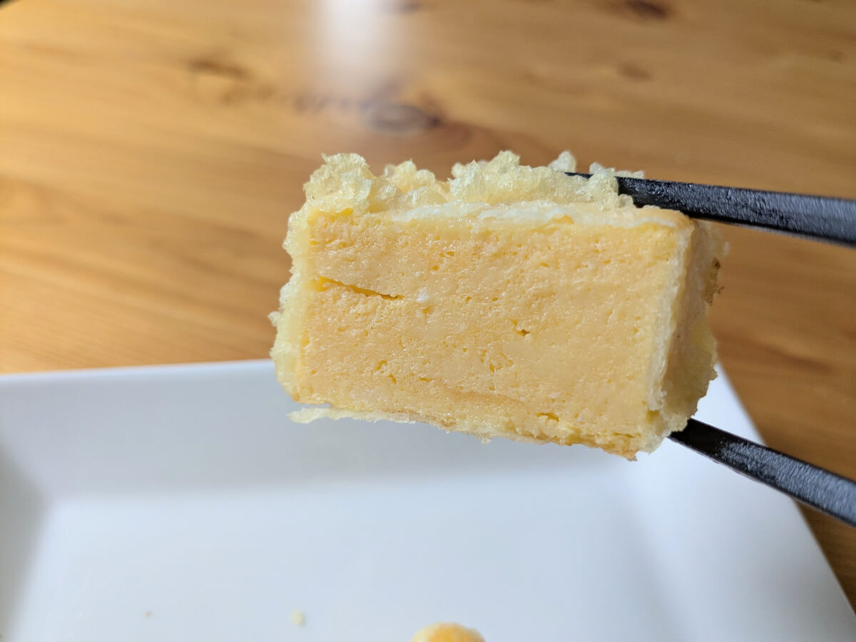 約3センチの厚みがあり、思わずあごが疲れるほどのボリューム感。ふわっとした食感と、卵本来のやさしい甘みを楽しめます。