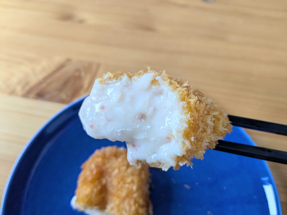 セブンイレブンやイトーヨーカドーのカニ入りクリームコロッケと比べても、よりクリーミーな印象で、ソースなしでも十分に美味しくいただけます。