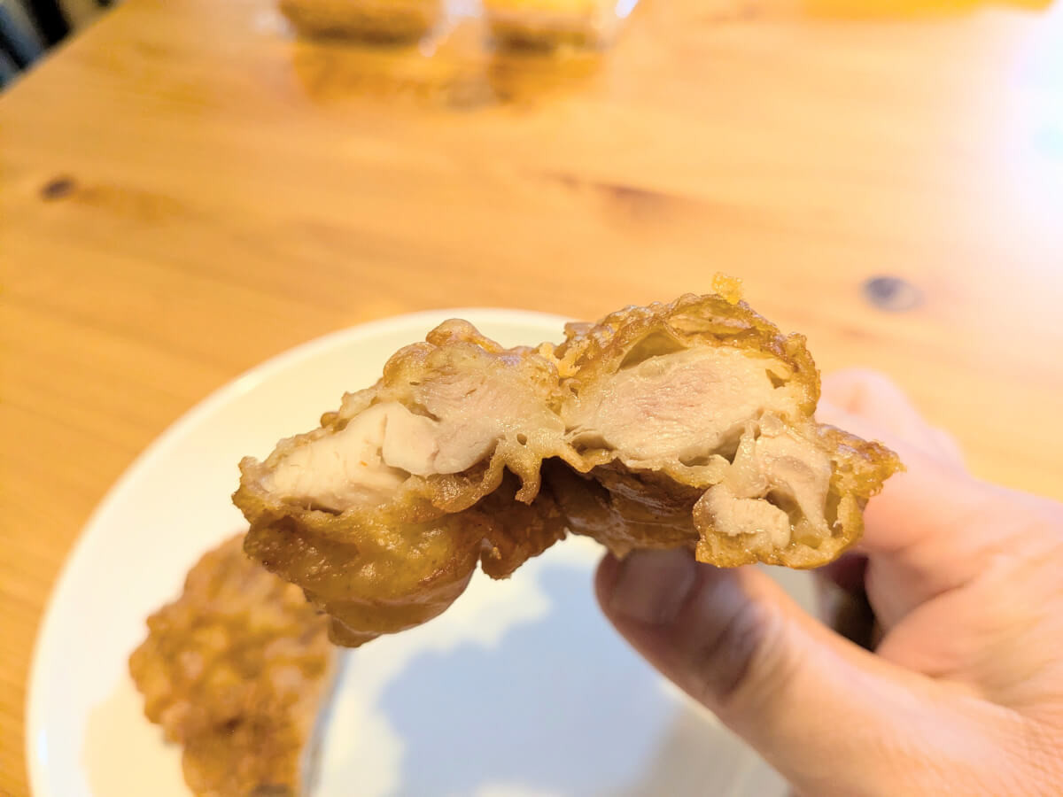トースターで約30秒温めていただきました。外はカリッとクリスピーで、ひと口噛むと中からジューシーな旨みが広がります。