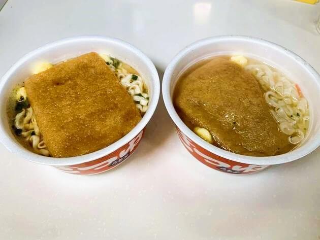 (左:そのままお湯を注いだカップうどん 右:鍋で煮たカップうどん)