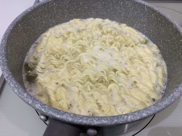 鍋に500mlの水を入れ、沸騰したら、麺を投入して3分茹でます。ここまではいつも通りですね。