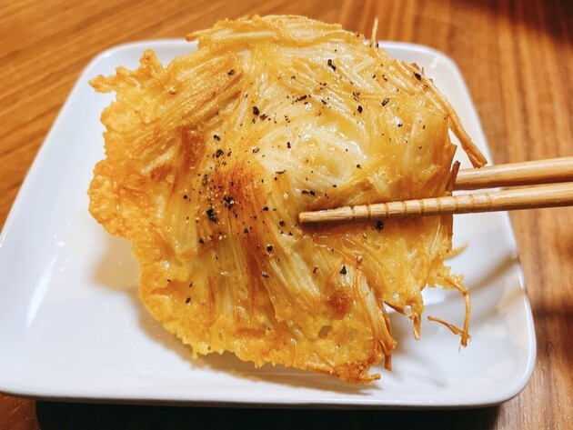 チーズをフライパンに押し付けて焼くことで、表面は香ばしい「カリカリ」の羽に。中は熱々のチーズが「とろ〜り」と溶け、えのき独特の「シャキシャキ」感と合わさる三重奏が楽しめます。