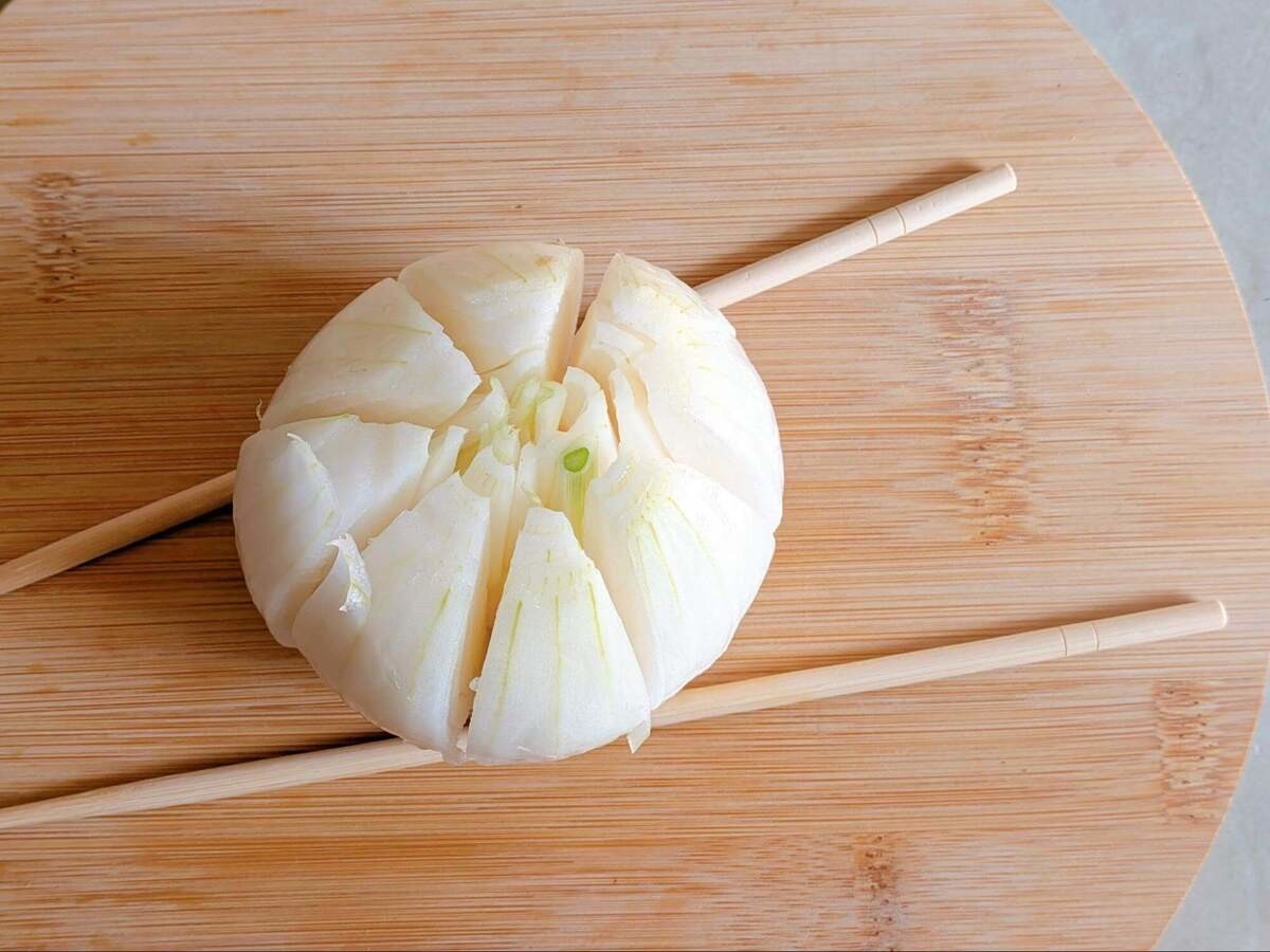 新玉ねぎは上下を切り落とし、深めの切り込みを入れましょう。十文字を4回、8等分くらいが目安です。