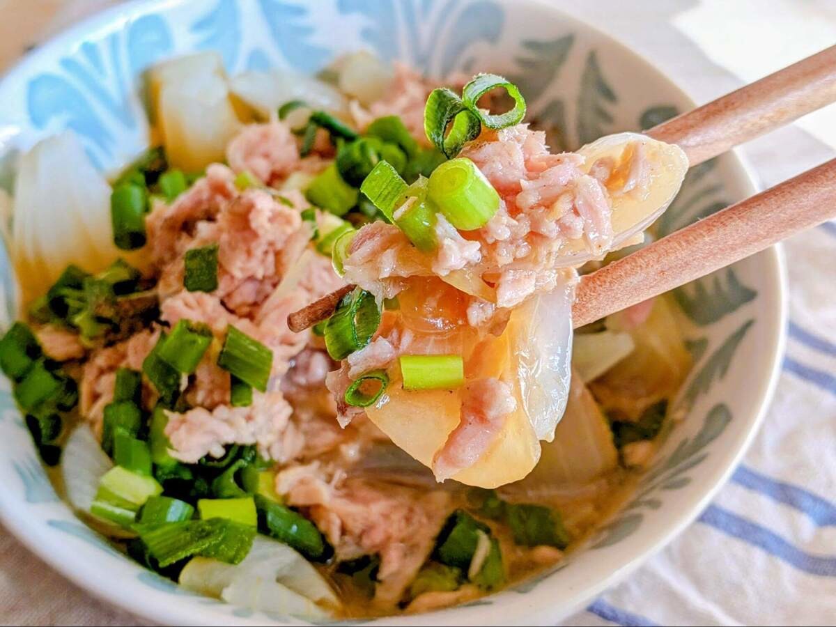 なお|農家のおかんさんのお野菜レシピ「新玉ねぎのツナバター蒸し」レンチンで主役級おかず完成