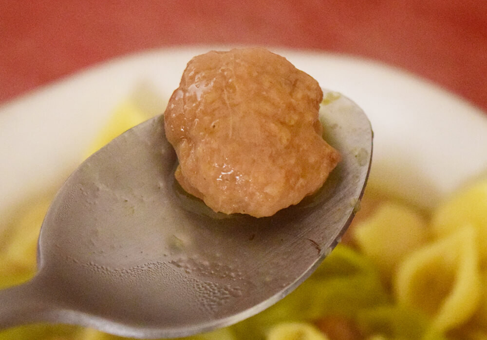 ゆで時間が想定以上に長かったためか、仕上がり時にはスープの量がかなり減ってしまいました。見た目については、全体的に前回と大きな違いはなく、既視感のある仕上がりです。ただし、具材として入っている肉団子は、前回よりもやや大きくなったように感じられますね。
