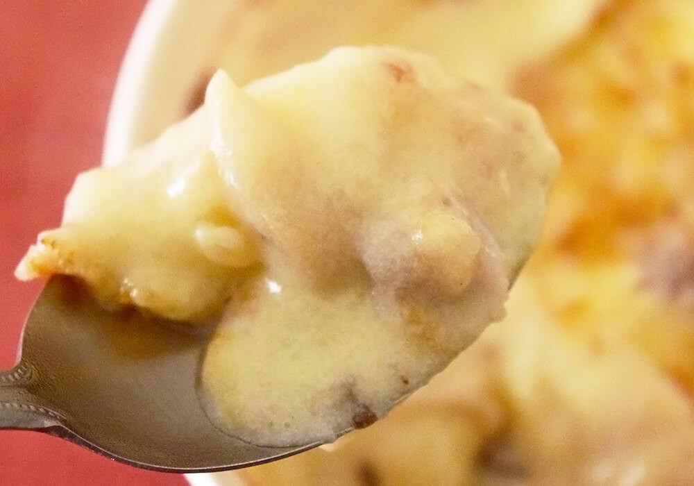 ホワイトソースはかなりさらりとした口当たりで、全体的に軽めの仕上がりです。そのぶん、チーズの存在感は控えめで、はっきり言ってしまえばコク不足という印象は否めません。生乳の風味を生かす狙いなのかもしれませんが、グラタンに求められる満足感にはやや届かないように感じます。