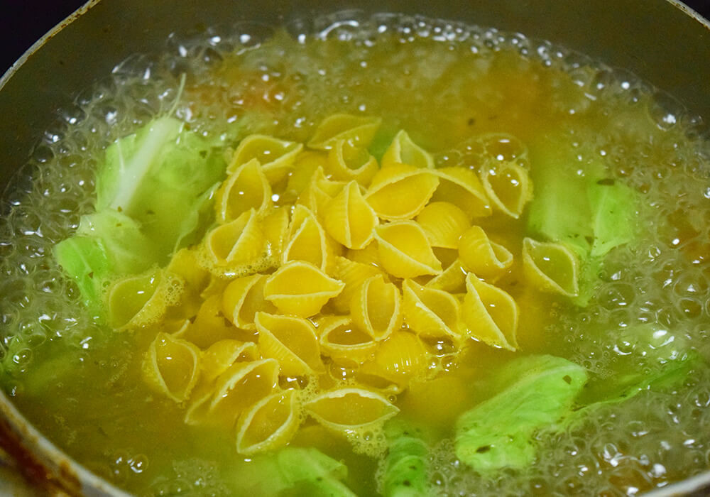 無印良品で販売されている「コンキリエ」290円(税込)を使用して調理。パッケージに書かれている「ゆで時間の目安」は12分ですが、その時間ではまだかたく、理想の仕上がりまでゆでると、およそ20分かかりました。