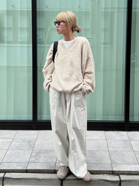 まだ肌寒いけれど春めきたい今の時期、頼りになるのが柔らかなオフホワイト。ニットの温もりはそのままに、全身をまろやかなエクリュトーンで繋げば、冬の重たさが嘘のように軽やかな印象へ導けます。ポイントは素材のメリハリ。ふんわりニットとハリのあるパンツでリズムをつければ、膨張などのっぺり見えも回避。インナーの白を首元にチラリと効かせ、顔映えも抜かりなく。