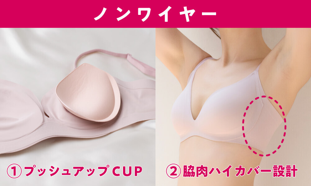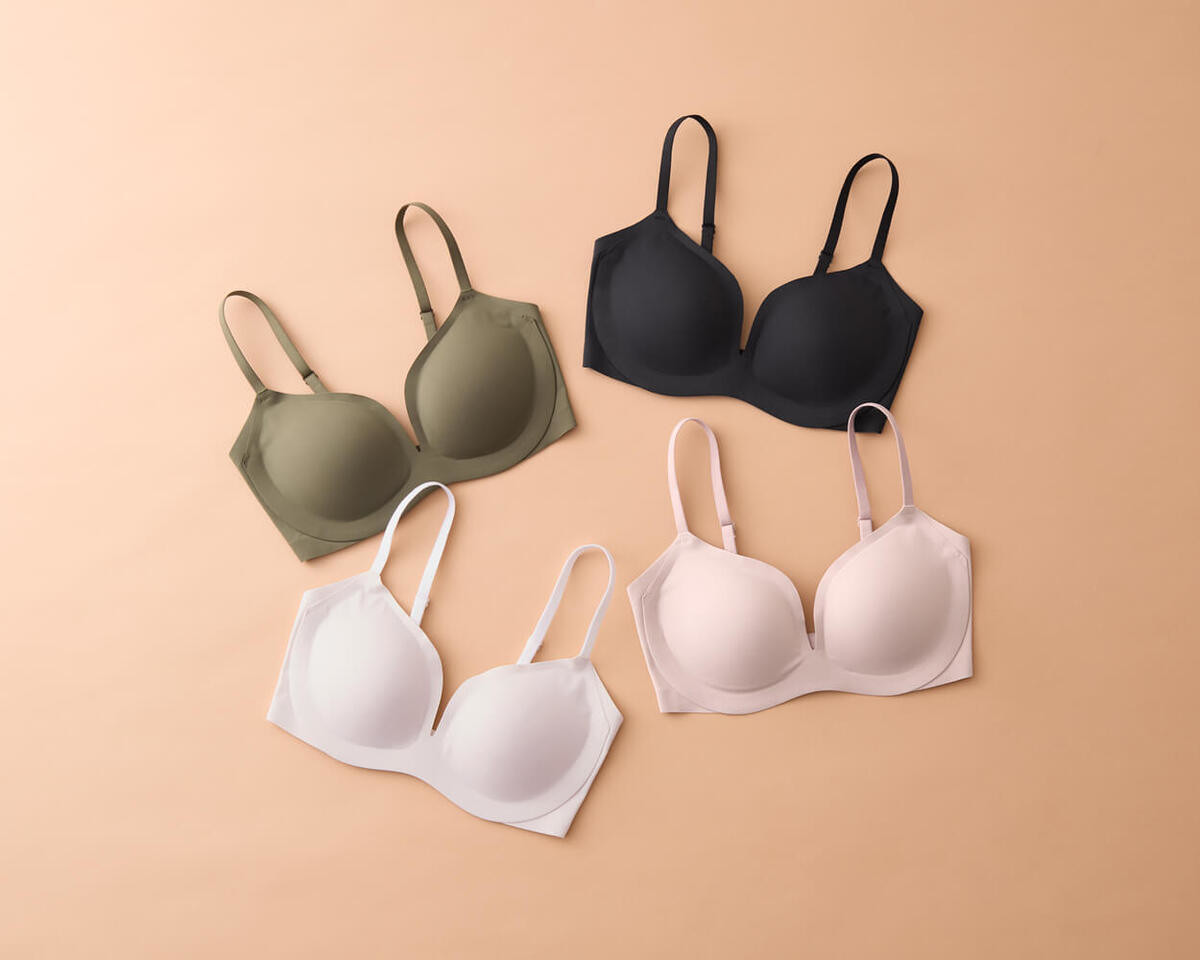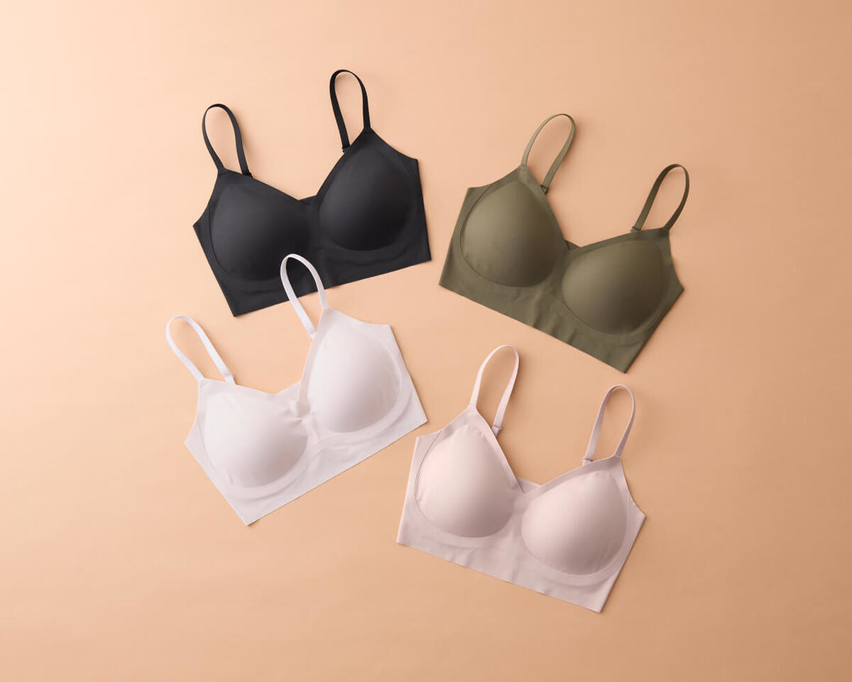 まるで、“肌の一部”のように馴染む着け心地で、ノンワイヤーでもバストの下の丸みにぴったり沿い、カップ上部もパカパカしにくく、1日中美しいバストシルエットをキープします。パーツ同士の段差も少なく、アウターにひびきにくい仕上がりです。