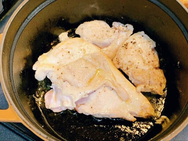 少し深さのある鍋やフライパンにサラダ油大さじ1をよく熱し、鶏肉の皮を下にして焼きましょう。皮がこんがりと色づいたら、上下を返し、表面をさっと焼いて一旦皿に取り出しておきます。