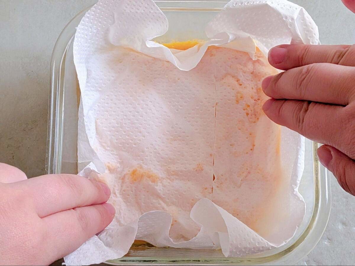 上からペーパータオルなどで押さえて成形したら完成です!電子レンジから出した瞬間、だしの良い香りがふんわり。