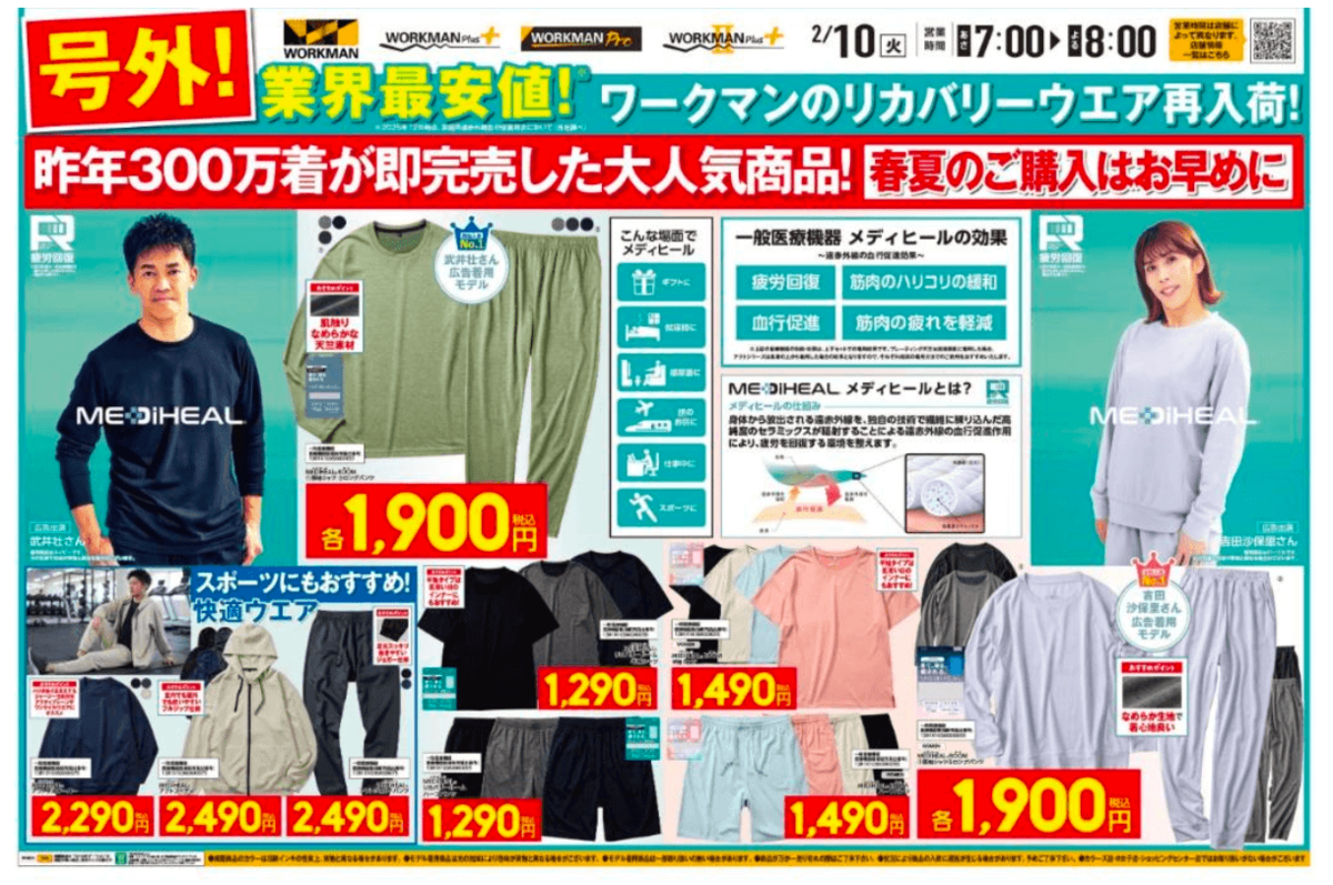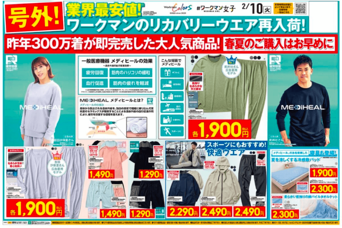 作業服を扱うWORKMAN Plusなどの既存店966店、作業服を扱わない新業態のWorkman Colorsとその前身の#ワークマン女子121店の、合計1087店を展開する株式会社ワークマンでは、2月10日(火)から昨年300万着が完売した大人気商品リカバリーウエア「MEDiHEAL」が全店で再入荷されます。